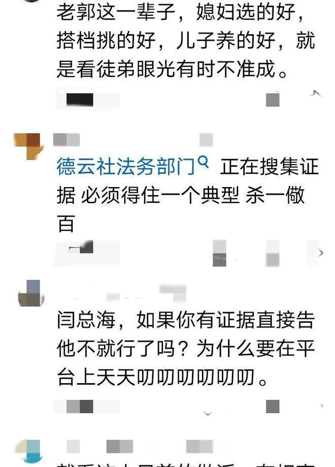 对此,有的网友说:德云社法务部门正在搜集证据,必须抓住一个典型,杀一儆百。还有人幽默地说,老郭这一辈子,媳妇、搭档、儿子都好,就是看徒弟的眼光有时不准。 人得感恩啊。